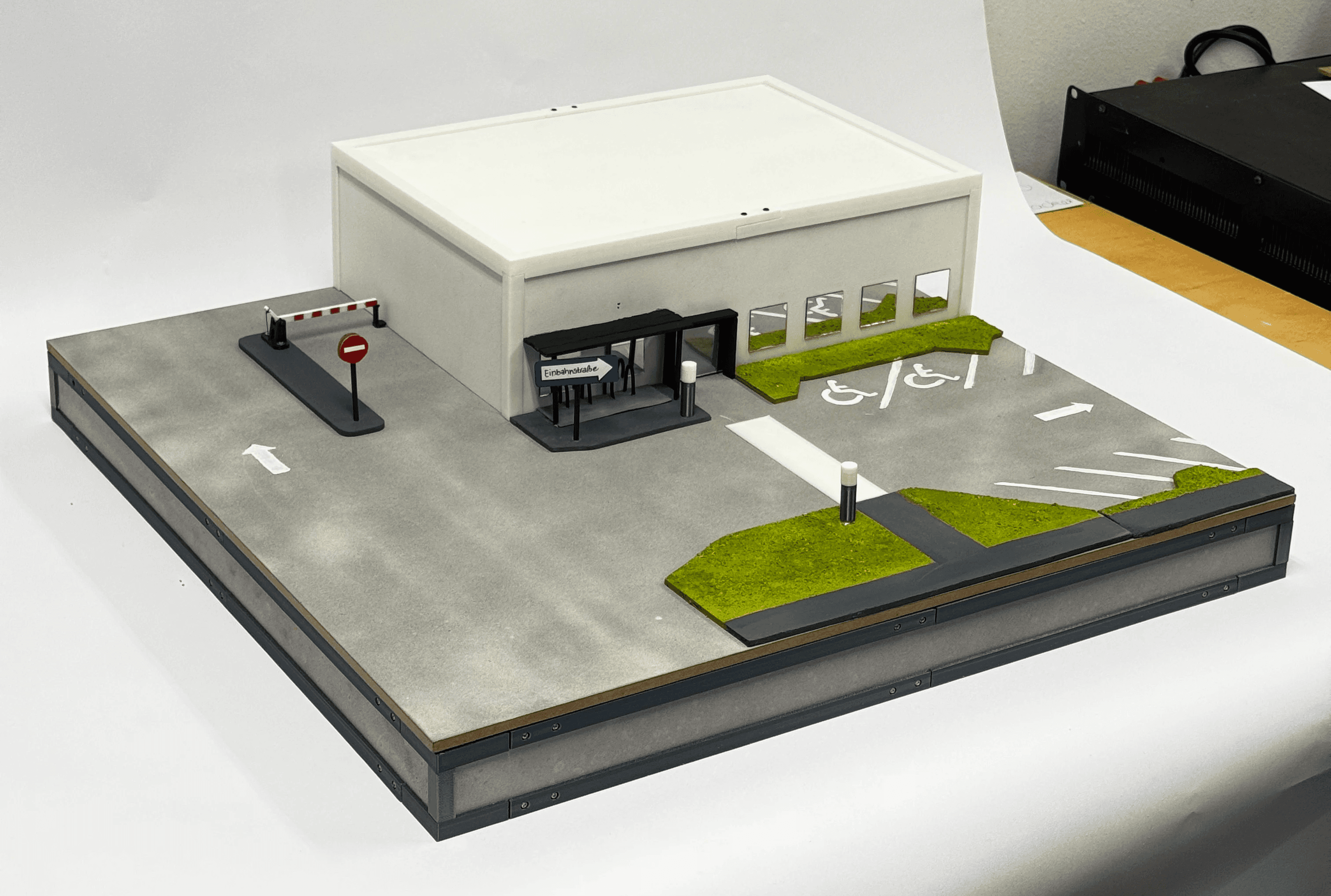 Physischer Prototyp mit Gebäude, Zufahrt und Parkplatz