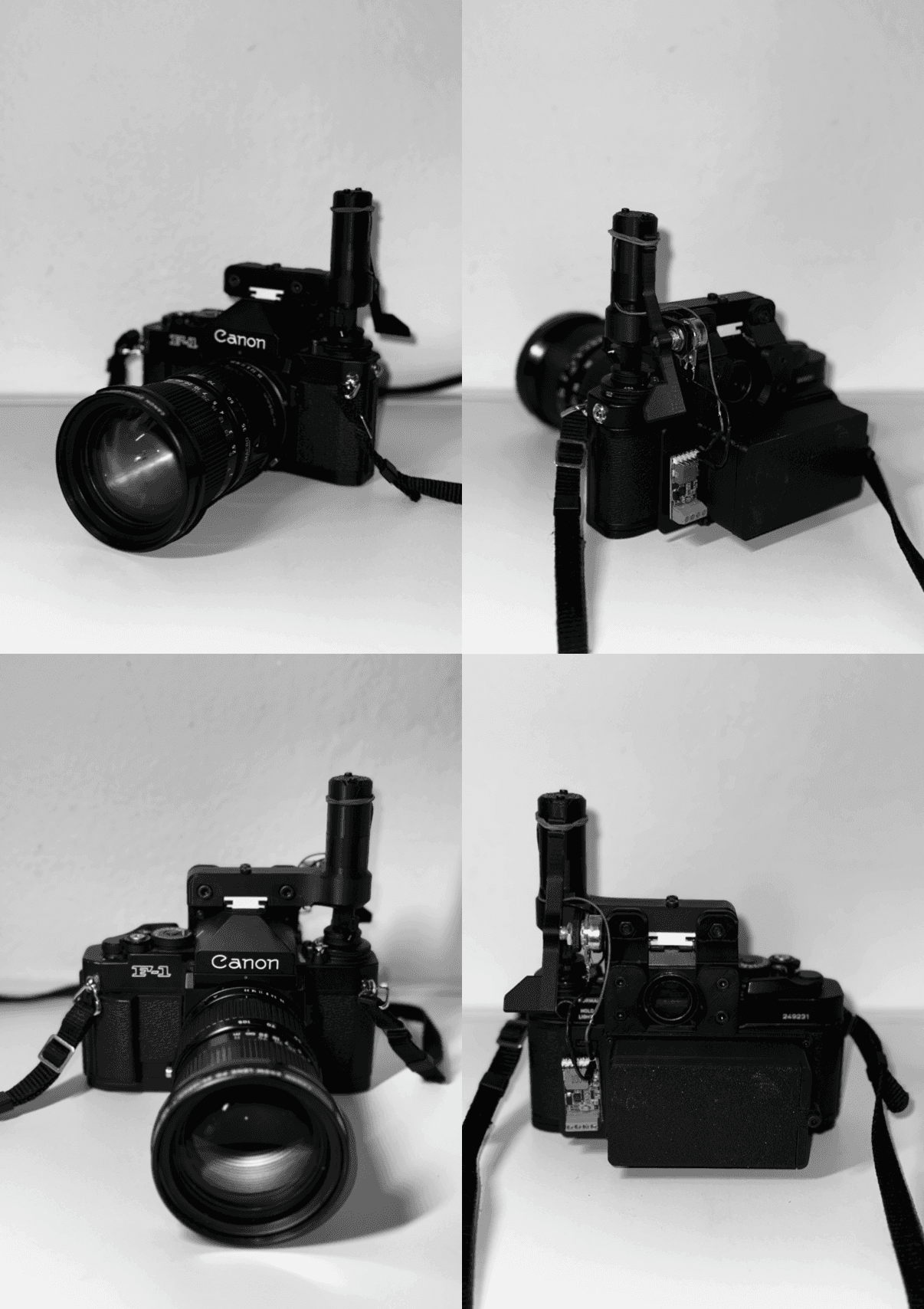 Der Prototyp wurde als Anbau-Modul entwickelt und besteht aus einem Motor, Akku, Potentiometer und einer mechanischen Verbindung zur Filmbewegung. Über das Potentiometer lässt sich die Geschwindigkeit beeinflussen, während der Motor den Film bei geöffneter Blende weiterbewegt. Dadurch wird der Aufnahmeprozess kontrollierbarer und wiederholbarer als bei rein manueller Bewegung.